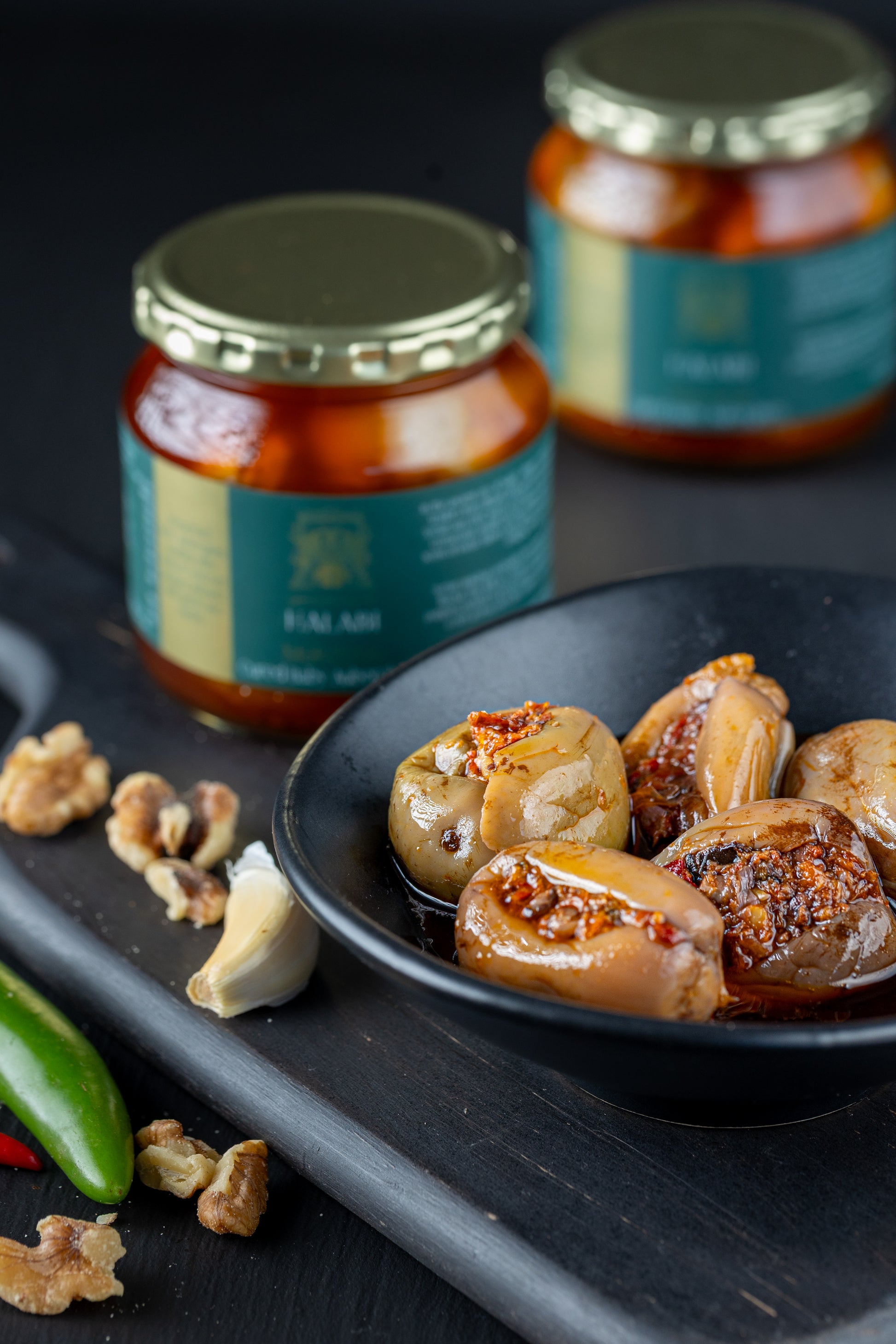 Pickled baby aubergines with a red pepper and walnut filling. A delicious staple in any Middle Eastern breakfast spread, Makdous has a savoury and tangy flavour.